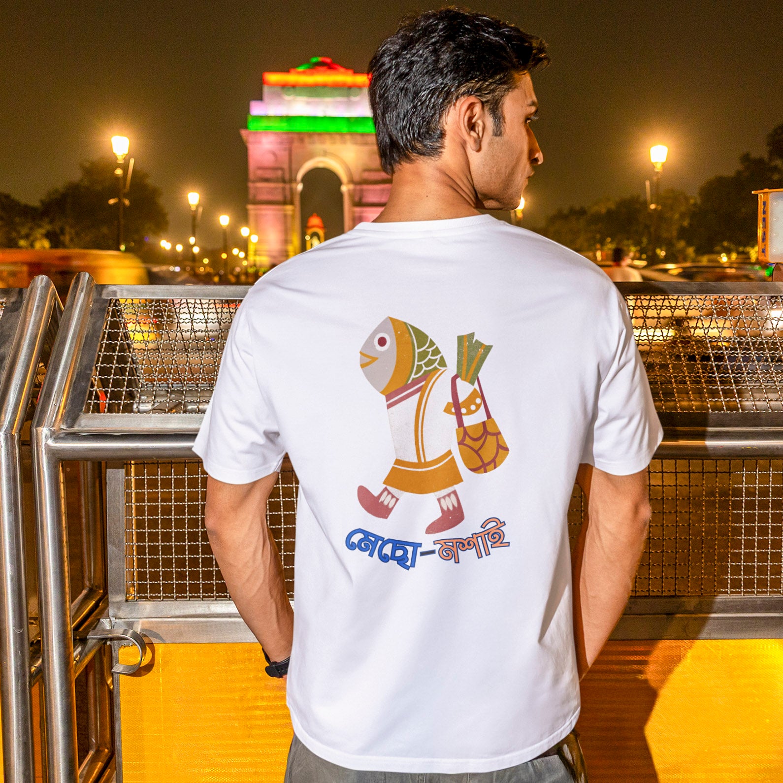 There is an undeniable fact - 'Bongs love fish!' And the age-old tradition of going to the bajar and buying the freshest piece of hilsa at an optimal price is a sacred art form in a Bengali household. This t-shirt is our homage to this ritual, a nostalgic nod to all our shared childhoods where we saw our uncles and fathers pick up the bajarer tholi on a Sunday morning and go out on an adventure!